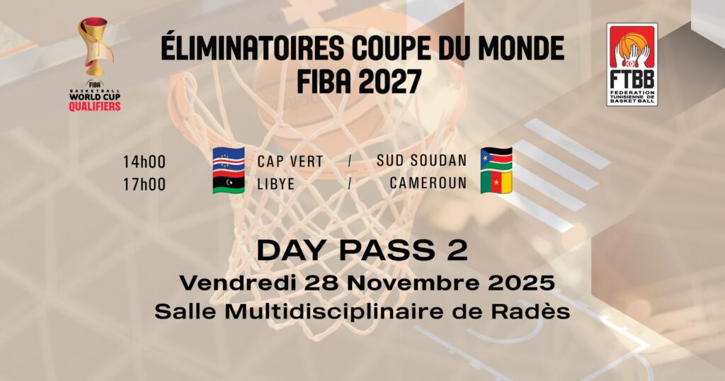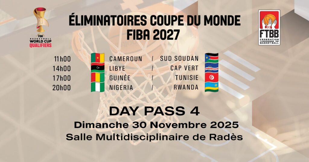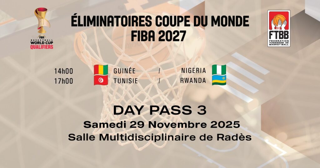 La Fédération Tunisienne de Basketball annonce le démarrage de vente des billets pour les rencontres de la première fenêtre des Éliminatoires de la Coupe du Monde 2027, qui se dérouleront à la Salle multidisciplinaire de Radès du 27 au 30 novembre 2025.
