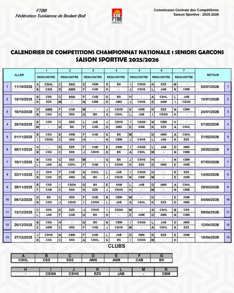 Calendrier Championnat – National 1 Garçons